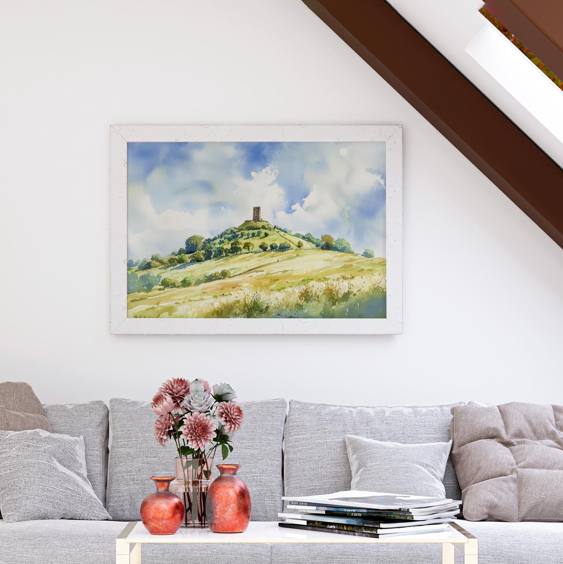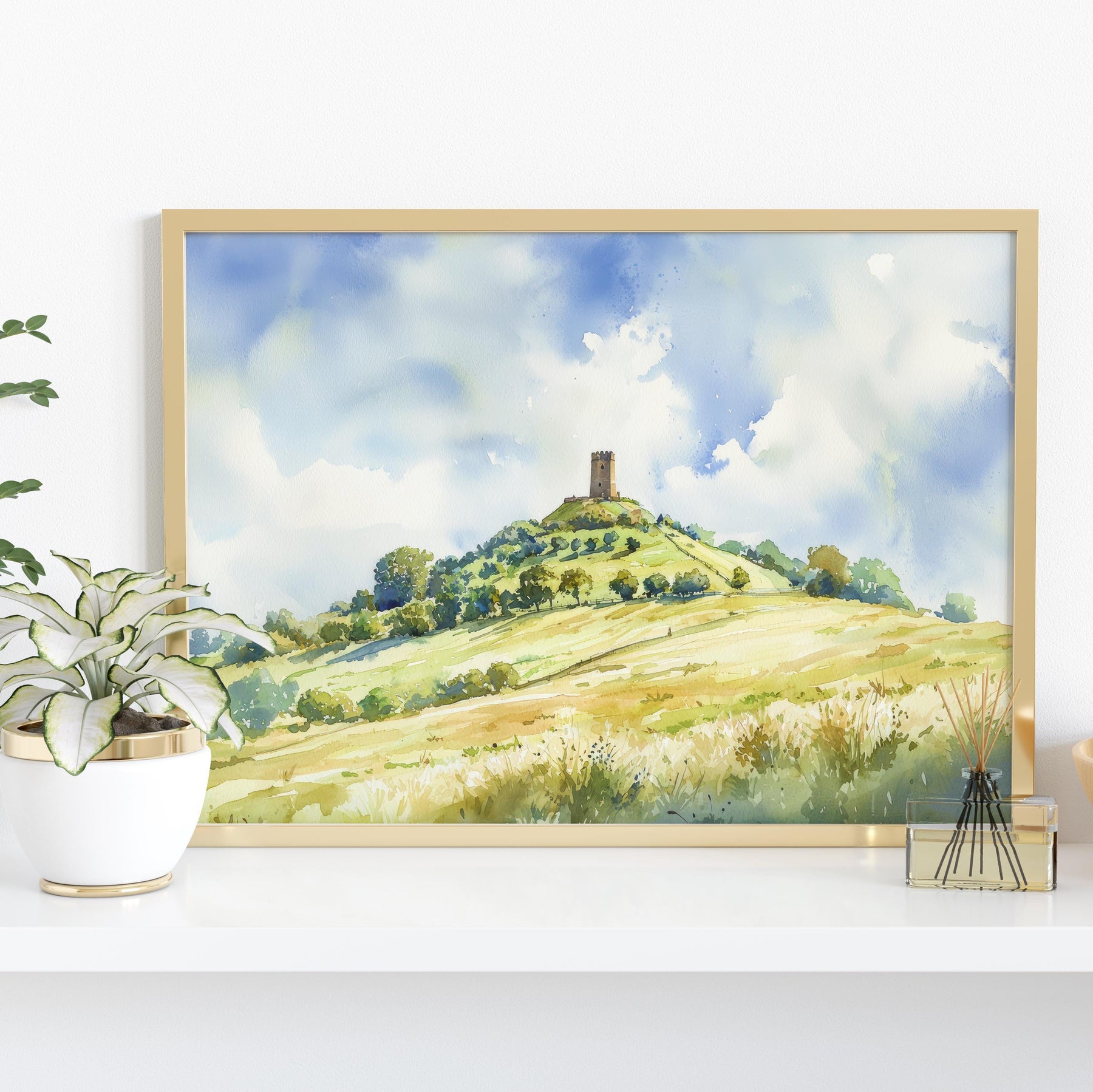 Glastonbury England Watercolor Poster Glastonbury Travel Print Somerset Town Painting Tor Hill Wall Art UK Souvenir