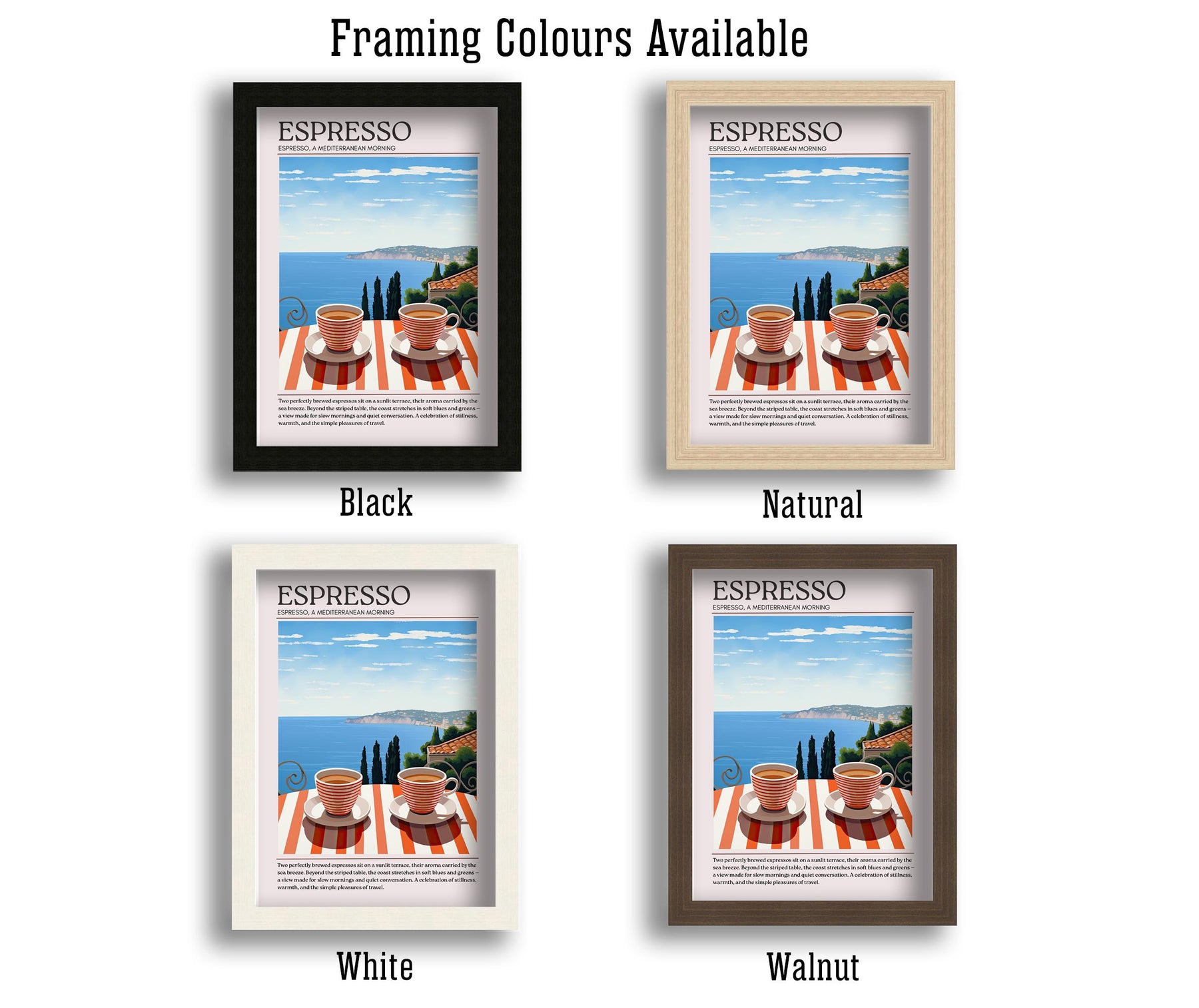 We offer sizes 5x7" - 30 x 40" Whether it's for a small space or a large wall, these sizes are perfect to match any room and style.