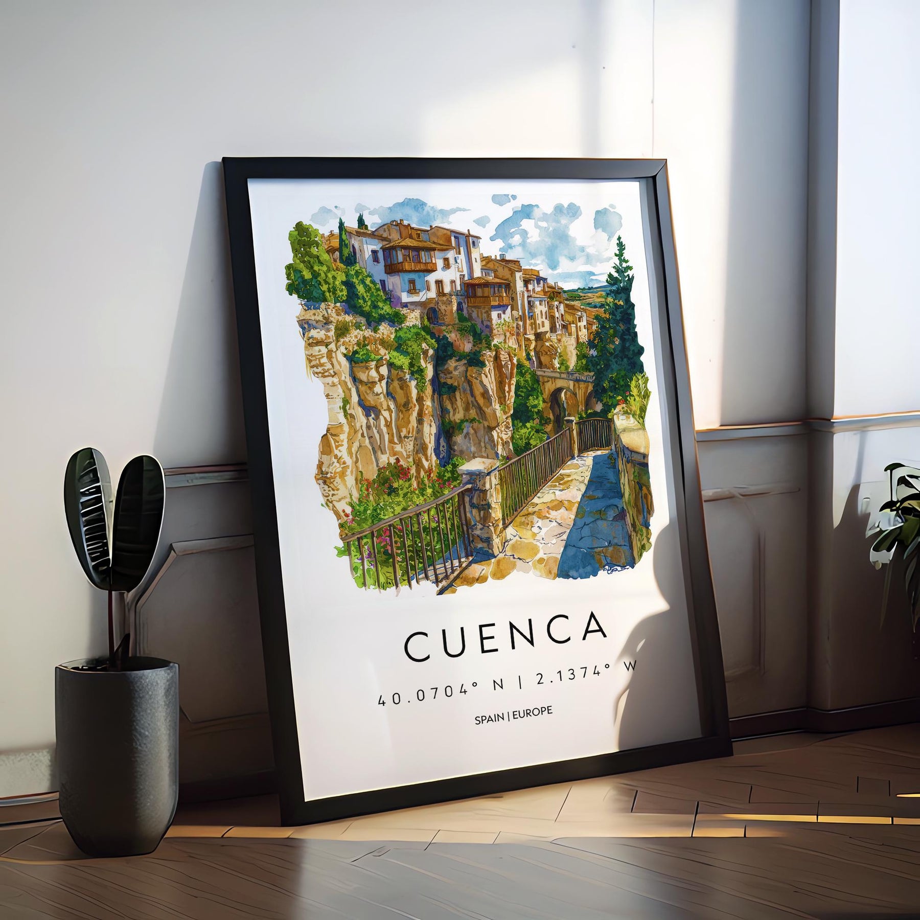 Cuenca Watercolor Poster Cuenca Travel Print Spain Wall Art Cuenca Decor Hanging Houses Scene Historic City View Cliffside Landscape Print